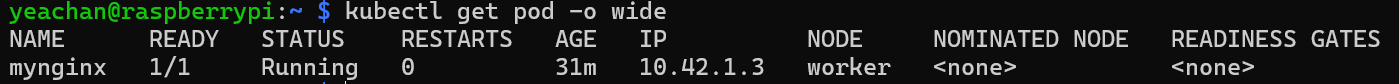 또 간단히 Pod의 IP를 바로 확인하려면 -o wide 옵션을 사용 할 수 있다.
