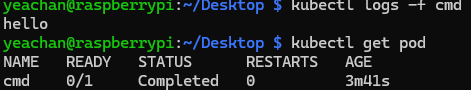 apply -f로 실행하면 hello메시지를 출력하고 완료된 상태인걸 볼 수 있습니다.
