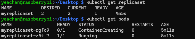 위에 myreplicaset-xxx와 같이 임의의 문자가 보이는데 이는 ReplicaSet이 지정해준 문자열입니다.