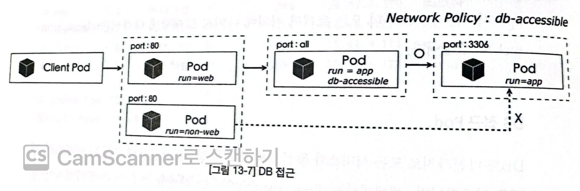 - 허용소스: db-accessable=true 라벨을 가진 Pod에 대해서만 허용