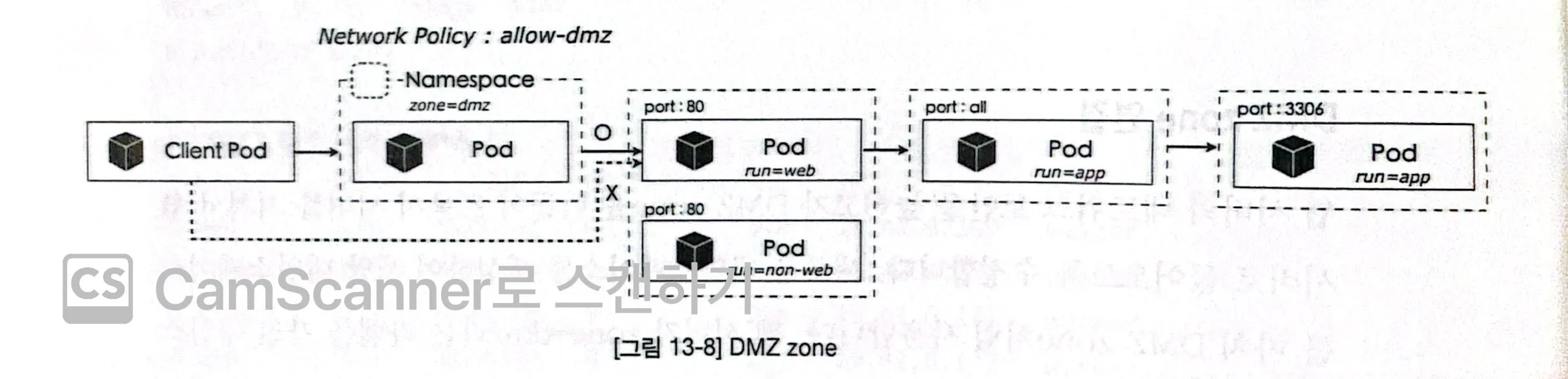 - 허용소스= zone=dmz라는 라벨을 가진 네임스페이스로부터 오는 트래픽만 허용