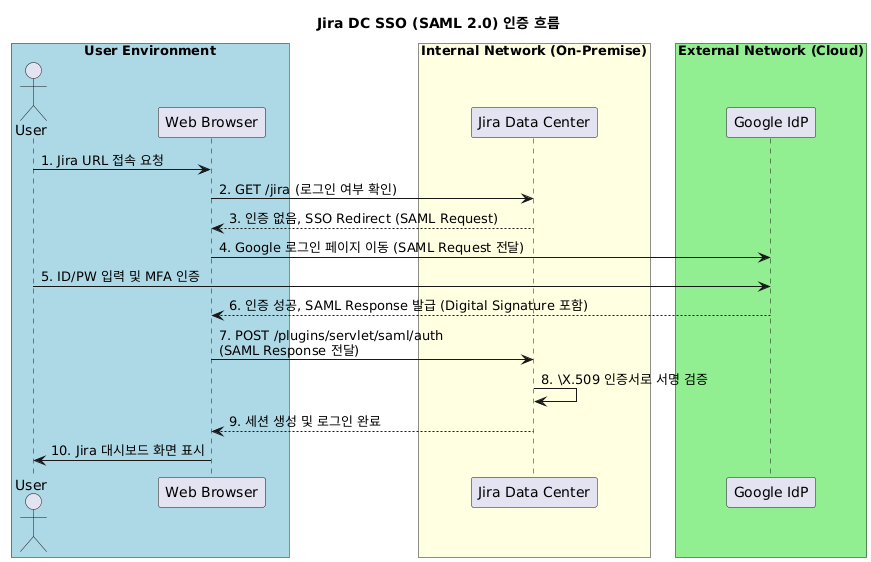 Jira Data Center는 외부 IDP(Identity Provider)와 SAML 2.0 프로토콜을 통해 인증을 위임한다.