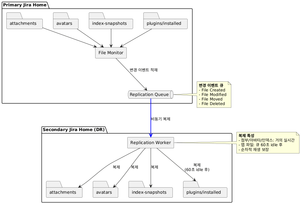 - 첨부파일, 아바타, Lucene 인덱스 스냅샷, 사용자 설치 앱 파일 등은 Jira의 File Replication 기능 또는 스토리지 수준 복제를 통해 DR용 secondary 위치로 비동기 복제한다.