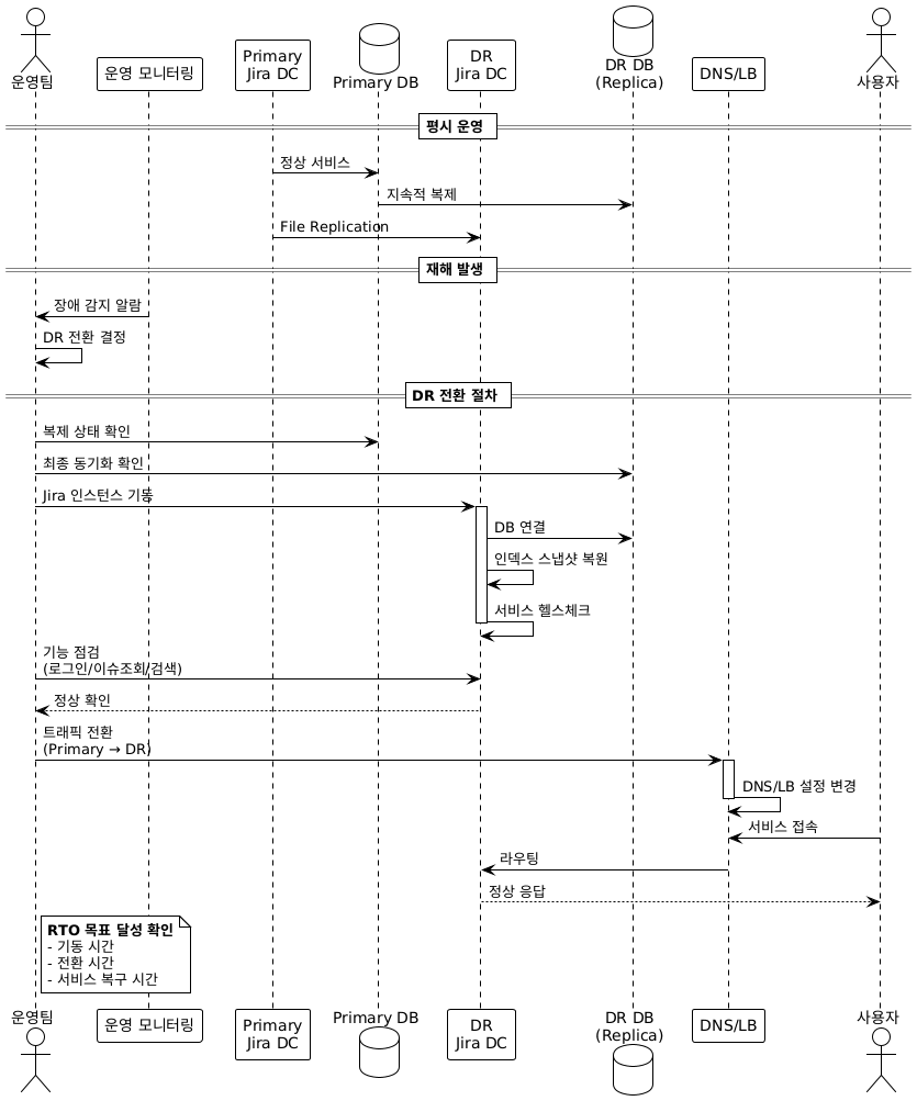 - RTO(Recovery Time Objective): DR 선언 이후 스탠바이 Jira 인스턴스를 얼마 만에 서비스 가능 상태로 기동할 것인지에 대한 목표이며, DR 전환 절차와 자동화 수준을 결정한다.