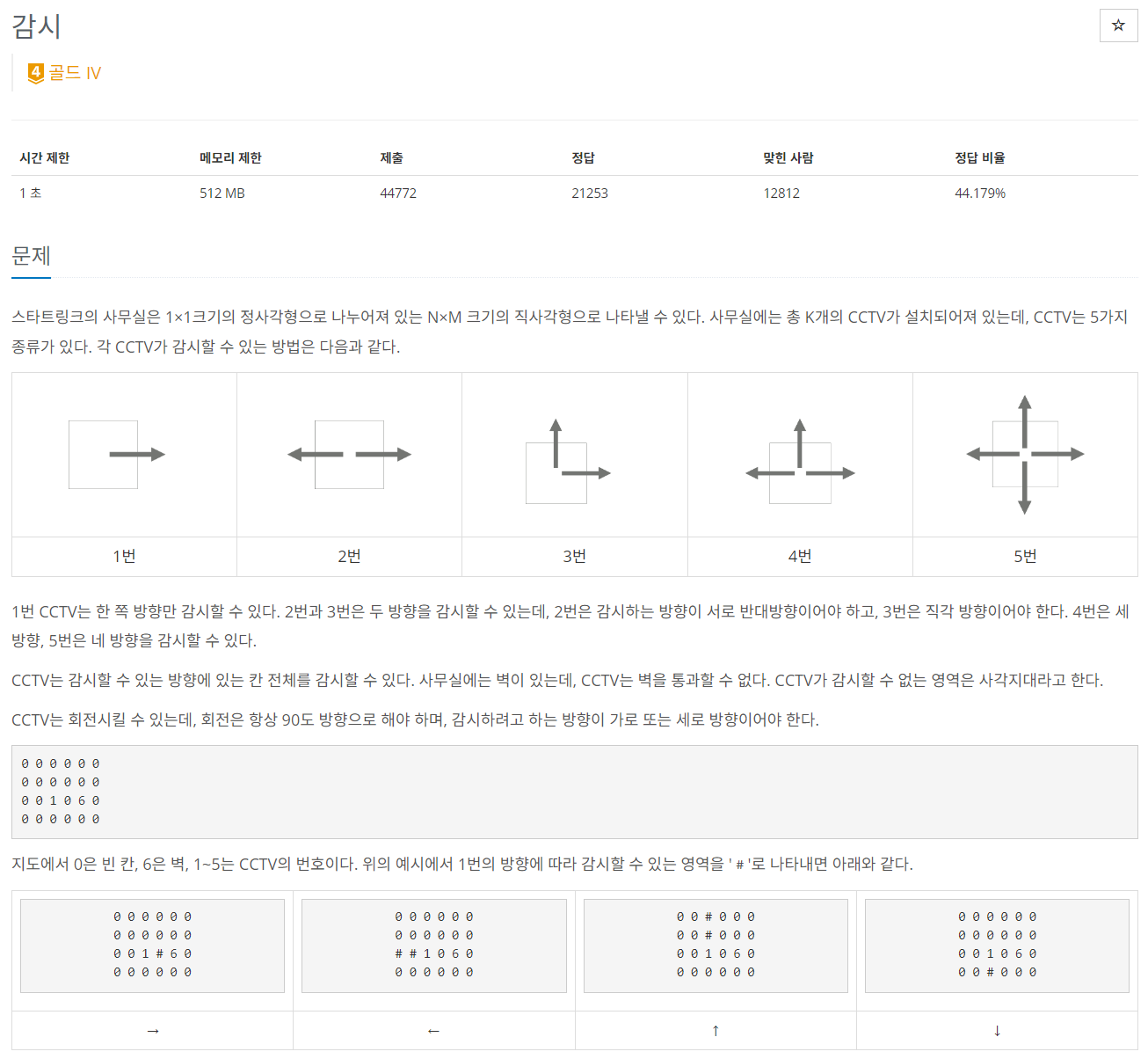 스타트링크의 사무실은 1×1크기의 정사각형으로 나누어져 있는 N×M 크기의 직사각형으로 나타낼 수 있다. 사무실에는 총 K개의 CCTV가 설치되어져 있는데, CCTV는 5가지 종류가 있다. 각 CCTV가 감